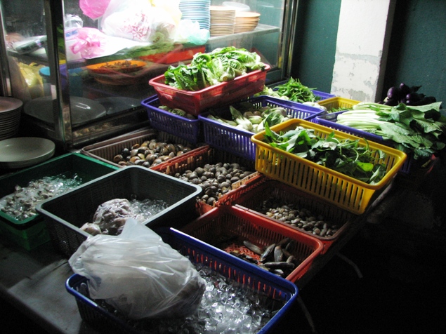 In front of the stall, there are many varieties of seafood and vegetables for you to choose.