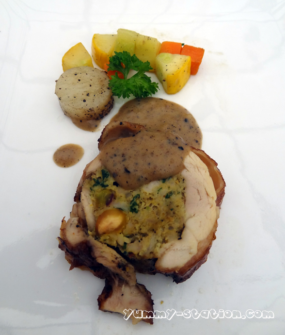 Poivrade Sauce & Potato Confit. I like the pistachio nuts in the stuffed chicken. The combination is really a good idea. The white round thing is not a scallop! At first we thought it was. It is a radish instead.