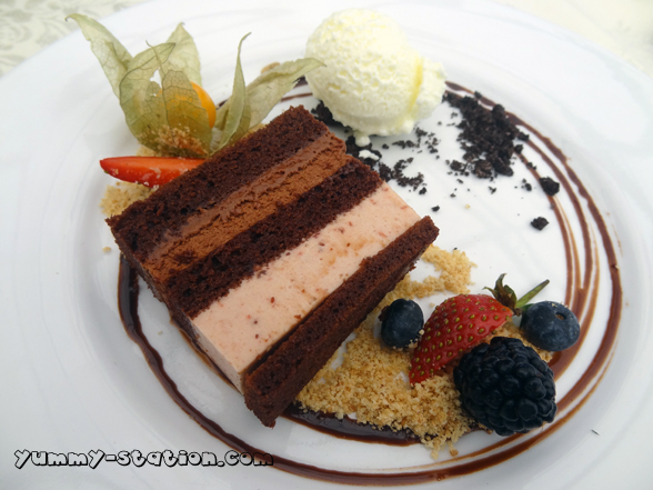 Chocolate Strawberry Mousse & Sponge. The dessert comes with a scoop of ice cream and berries. Love the combination.